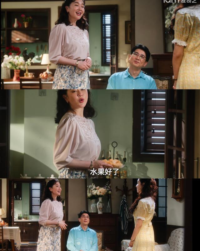 48岁的她演音乐教授的太太,女主要喊一声师娘的。她看到漂亮女学生围着装复转就紧张,听说丈夫要少收学费马上从厨房冲出来打岔。